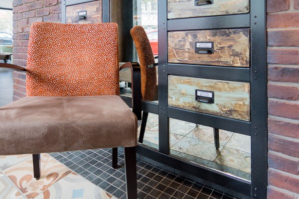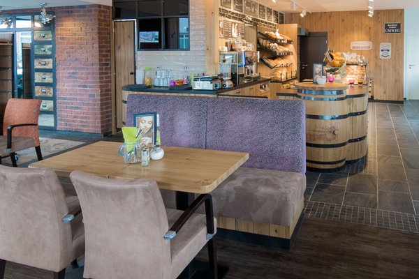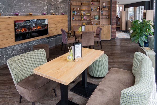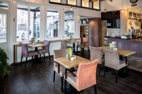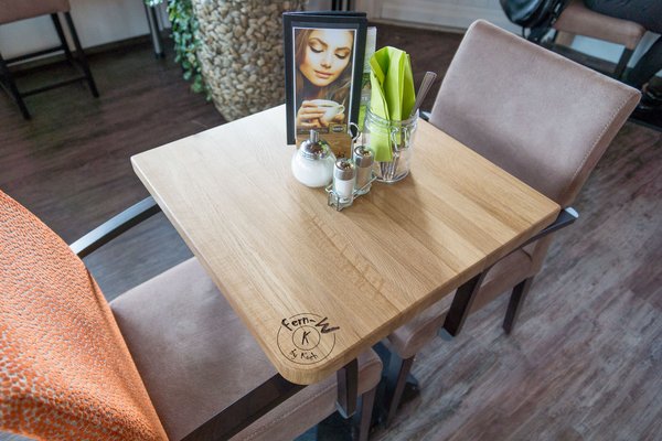 Ein Logo-Branding ziert die Echtholzplatten der Tische, die Bestuhlung ist farblich liebevoll abgestimmt.